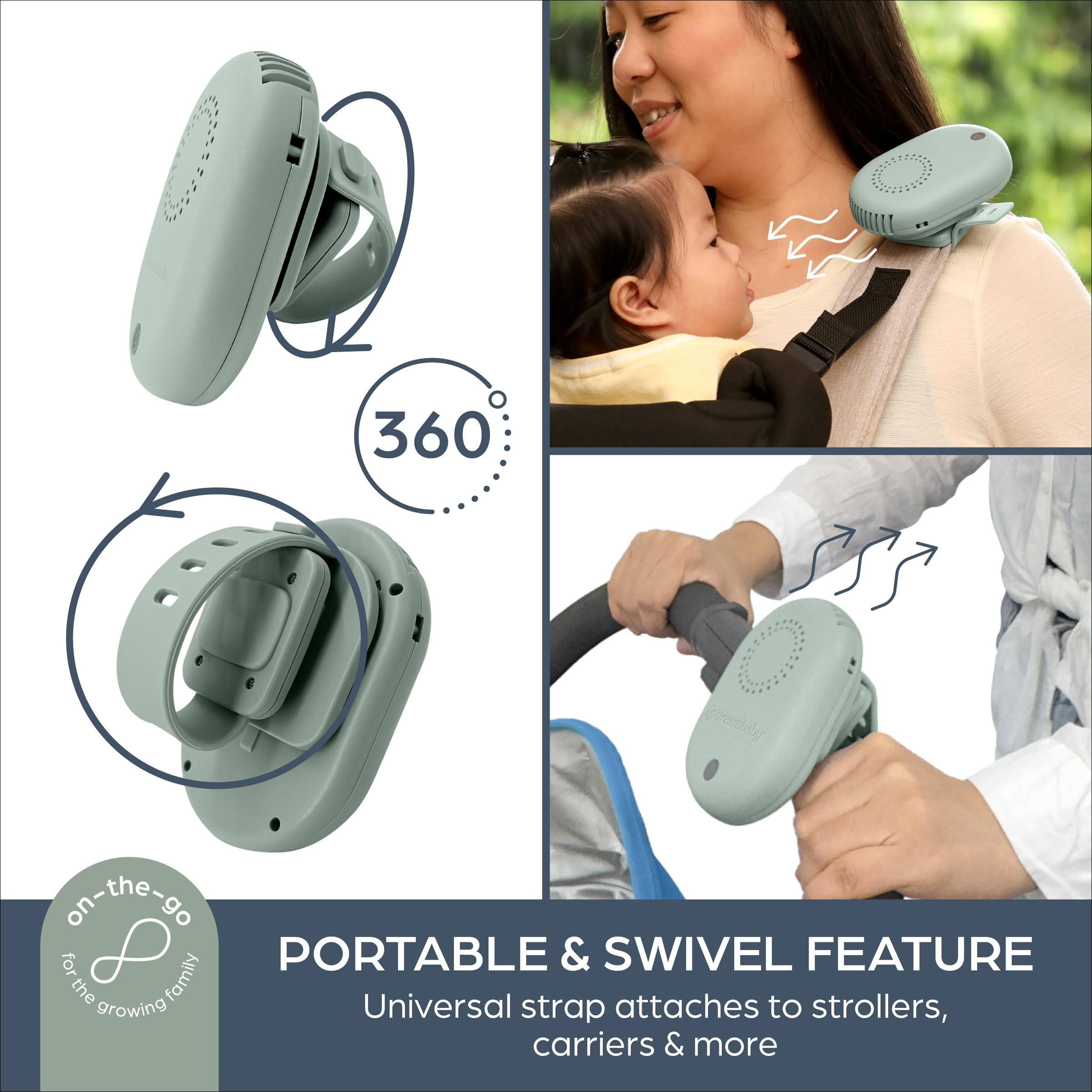 Dreambaby Breezz-to-Go USB Rechargeable Bladless Baby Fan with Swivel Strap – Portable Cooling for Strollers, Car Seats & Travel